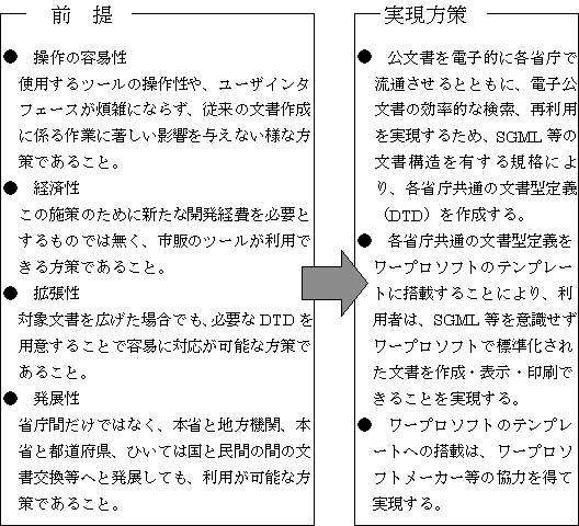 電子公文書の標準化の実現方策の基本的考え方は、上記の目的及び「行政情報化推進基本計画の改定について」(平成9年12月20日 閣議決定)に基づき、以下のとおりとする。