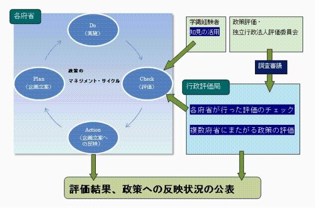 「Plan(企画立案)」、「Do(実施)」、「Check(評価)」、「Action(企画立案への反映)」という政策のマネジメント・サイクルの中に組み込まれ、実施されます