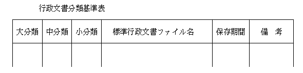 | 施行令第16条第1項第1号に規定する行政文書の分類の基準は、大分類・中分類・小分類の3段階のツリー構造による。また、毎年1回見直しを行い、必要と認める場合には改定を行う。 なお、小分類の下に施行令第13条第2項第1号の行政文書ファイルを類型化した「標準行政文書ファイル」名を記載する等により、行政文書ファイルの適切な保存にも活用できるよう「行政文書分類基準表」を定めるものとする。 |