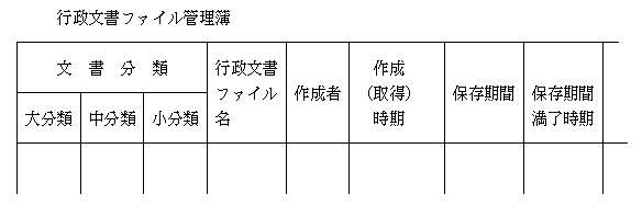 | (4) | 3の行政文書ファイル管理簿の更新において、「随時」とは、事務処理が完結して行政文書ファイルを作成した都度登載する場合、「年1回以上定期的」とは、年度当初に前年度に廃棄した行政文書ファイルについて廃棄した旨を記録する場合や前年度1年間に作成した新規行政文書ファイルの登載を行う場合等を想定している。 | |||||||||||||||||||||||||||||||||||||||||