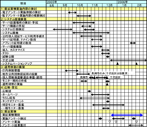 ・ 電子アンケートについては、「システムの導入」「公的個人認証サービス関連手続き」「運用体制整備」「モニター募集」などが挙げられます。長岡及び千代田での実証実験の際の手順とスケジュールは、下図の通りでした。