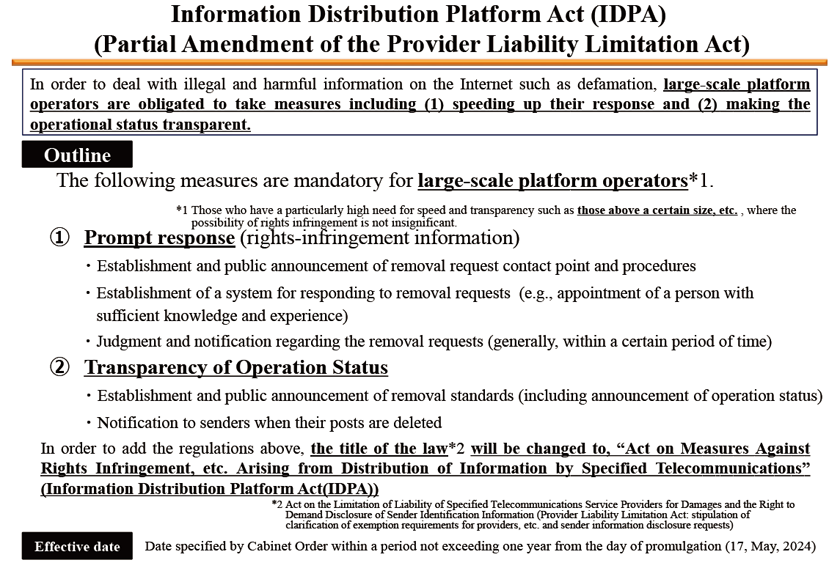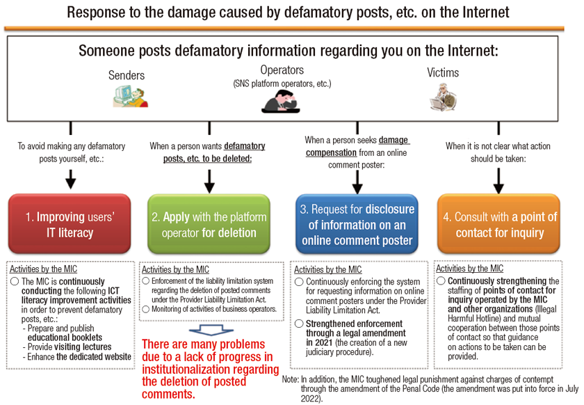 In order to deal with illegal and harmful information distributed on the Internet, the MIC has adopted and implemented the following four key measures: (i) improving users’ ICT literacy, (ii) enhancing transparency over the post removal by platform operators, (iii) facilitating the disclosure of senders’ information, and (iv) strengthening response to inquiries. In particular, regarding (iii) facilitating the disclosure of senders’ information, the MIC has taken measures to strengthen enforcement, such as amending the Provider Liability Limitation Act in 2021 and creating new judiciary procedures concerning requests for disclosure of senders’ information.