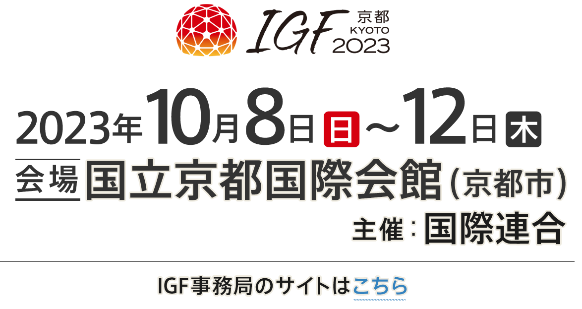 IGF(インターネット・ガバナンス・フォーラム)は、インターネットに関するあらゆる課題について、国連主催のもと、多様な関係者が対等な立場で対話を行うインターネット政策の分野で最も重要な会議の1つです。2006年の第1回会合以降毎年開催されており、第18回目となる本会合が京都で開催されます。今回の会合では、“Internet We Want – Empowering All People -”(私たちの望むインターネット-あらゆる人を後押しするためのインターネット-)という全体テーマのもと、多様なステークホルダーが主催する約300のセッションが開催され、あらゆるインターネットの諸課題について議論を実施します。
