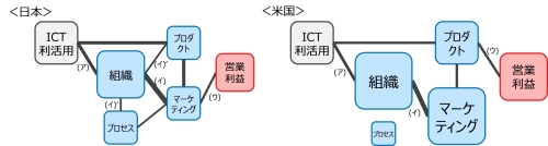 ICT利活用については、日米とも、ICT利活用からプロダクト・イノション、組織イノベーベーションと直接的な関係がある点は同じであるが、以下の違いがみられます(図表5)。