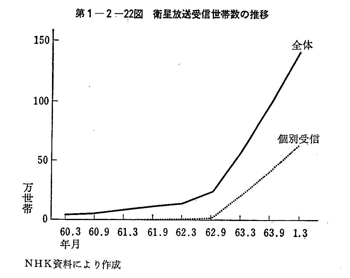 衛星放送の受信世帯数はソウルオリンピックの中継等,魅力的な放送番組の提供により普及が促進され,63年9月末に100万世帯に達し,平成元年3月末現在140万世帯と,前年同期に比べ,約2.4倍となっている(第1-2-22図参照)。