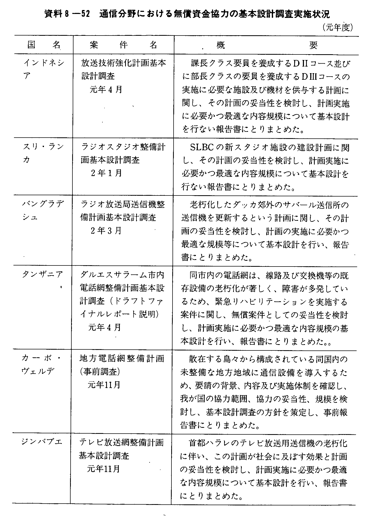 資料8-52 通信分野における無償資金協力の基本設計調査実施状況