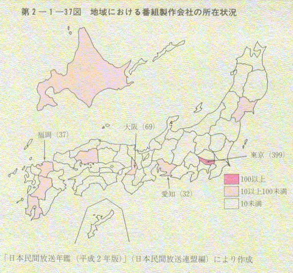 第2章 豊かな生活と情報通信(2)地域の生活情報通信環境における問題点以上みてきたように、地域における生活情報通信環境は、地域情報圏と全国規模の情報圏とのかかわりあいを中心として形成されており、それを支える情報通信基盤も整備されつつあるが、そこには、次のような問題点もある。[1] 情報通信基盤の整備状況には、地域による格差があること。 [2] 比較的地域独自の情報ニーズにこたえ得る情報通信基盤が整備されても、現状では全国規模の情報交流機能が中心となり、地域情報圏の交流に重点を置く情報通信基盤としての機能をなかなか果たし得ないこと。 [3] 地域から全国に向けての情報発信が極端に少なく、全国規模の情報圏の多極化が進んでいないこと。 [1]の問題については、(1)項でみてきたとおりである。また、地域独自の情報通信基盤についても、整備状況や取組状況等は地域によって一様ではない。更に[2]の問題については、テレビジョン放送の難視聴解消を目的として設置されたものが大半であるようなCATV等にその現状をみることができる。ただし、CATVは、最近次第に多チャネル化が進む傾向にあり、その番組も既存の民間テレビジョン放送や衛星放送の再送信、あるいは映画やスポーツ番組のほか、地域独自の番組を制作・放送するものが増えており、地域情報圏を支える情報通信基盤としての機能を果たすことが期待される。[3]の問題については、情報の東京一極集中と大きくかかわる問題である。ここでは、情報の生産・発信に着目し、その現状について概観する。 (情報の東京一極集中) テレビジョン放送における情報交流の現状についてみたように、全国的な情報通信基盤を通じて地域に流通する情報は、国や企業等の中枢管理機能等の東京一極集中を背景に、その大部分を東京からの発信によっている。情報の生産・発信等に携わる事業者の地域における所在状況についてみると、その東京への偏在は顕著であり、情報の東京一極集中の現状がうかがわれる。 [1] 番組製作会社の所在状況 国内にある番組製作会社の所在地を都道府県別にみると、元年度においては、全国の約5割に当たる399社が東京に集中しており、大阪の69社がこれに次いでいる(第2-1-37図参照)。 [2] ビデオテックス情報提供者の所在状況 3年1月末現在において、NTTのビデオテックス通信網に接続して各種のサービスを提供する情報提供者(IP)の所在地についてみると、全国の約4割に当たる254のIPが東京に集中しており、46IPの大阪がこれに次いでいる(付表9参照)。 [3] データベースサービス事業者の所在状況 データベース・サービスのプロデューサあるいはディスト,リビュータとして通商産業省の「データベース台帳総覧」(元年度度)に収録されている企業の所在地についてみると、東京に所在しているものが約9割に当たる96企業となっており、著しい東京への集中がみられる。 [4] 書籍・雑誌等の出版社の所在状況 電気通信以外のメディアについても、情報の一極集中の現象をみることができる。書籍・雑誌等の発行所の所在地についてみると、元年度末現在で全国の8割に当たる3,452社が東京に集中している。これは、大阪の211社、京都の136社と比較しても圧倒的に多数であり、出版による情報についても東京からの発信比率が極めて高いことかうがかわれる。 以上みた情報の生産・発信等に携わる事業者の全国における所在の状況から、情報発信の東京への一極集中の現状は明らかである。 今後、このような情報の一極集中を是正し、地域・全国規模・世界規模の各情報圏における情報の交流を一層活発化させるためには、地域から大都市、さらには世界に向けて発信される情報の流れを増大していく必要があり、地域における情報発信力の強化は重要な課題である。