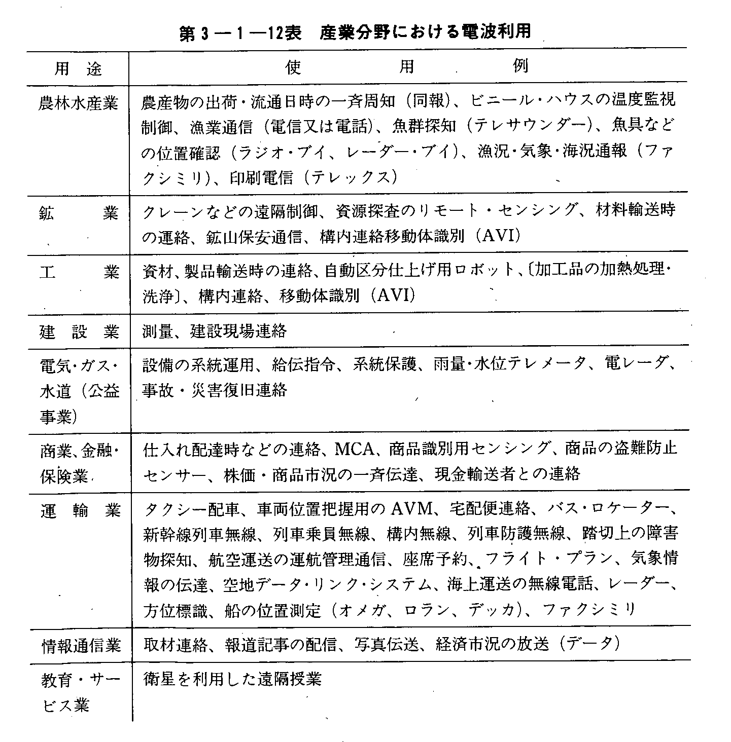 第3章 ゆとりと活力のある情報社会の形成と電波利用4 産業分野における電波利用産業分野における電波利用は、タクシー、宅配便等の旅客・貨物運送業における移動通信での利用が一般的に知られている。さらに無線通信が災害に強いことから、電気・ガス・水道などの公益事業においても、供給・運用状況の監視、指令、緊急時の連絡などに使われている。漁業、海運業においては、情報伝達の唯一の手段として、緊急時、遭難時の連絡に無線通信が不可欠であることは言うまでもない。また、通信以外の利用として、製造業においては計測、洗浄、加工、加熱等様々な用途に電波が利用されている(第3-1-12表参照)。さらに最近の動向としては、新聞業、流通業における衛星通信の利用や製造販売業におけるテレターミナルなどのデータ通信システムの利用も進められている。