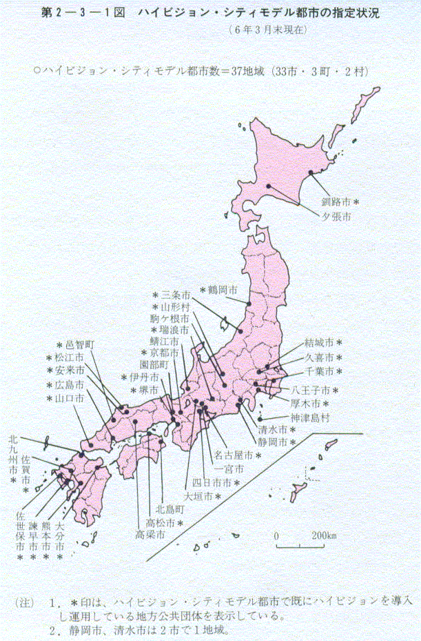 第2章 情報通信政策の動向(4)ハイビジョンの普及促進ア ハイビジョン・シティモデル都市の指定「高度映像都市(ハイビジョン・シティ)構想」は、高度映像メディアであるハイビジョンを導入し、映像の持つヒューマンコミュニケーション機能を活用することで、地域の活性化と魅力ある都市づくりを目指すものであり、郵政省は、モデル都市のシステム構築に対し、財政投融資、無利子融資、税制等の各種の支援措置を講ずることにより、この構想の推進に積極的に取り組んでいる。ハイビジョン・シティモデル都市としては、5年度に、新たに岡山県高梁市、島根県邑智町が指定されたことにより、5年度末現在、37地域が指定されており、このうち29地域(48か所)にハイビジョンシステムが導入されている(第2-3-1図参照)。 イ ハイビジョン番組制作設備の整備 ハイビジョン番組については、従来のNTSC方式に比べて、番組制作機器(カメラ、VTR等)の価格が3倍以上することが、ハイビジョン放送の普及を阻害するひとつの要因となっている。例えば、(社)ハイビジョン推進協会による試験放送においても再放送の割合が半分程度になっており、ハイビジョン放送の本格的な実施のためには、放送番組制作の促進が不可欠となっている。 このため、郵政省では、6年度から、放送事業者や番組制作事業者がハイビジョン用ソフト制作設備を取得する場合に財政的支援を与えることにより、番組制作を促進することとしている。
