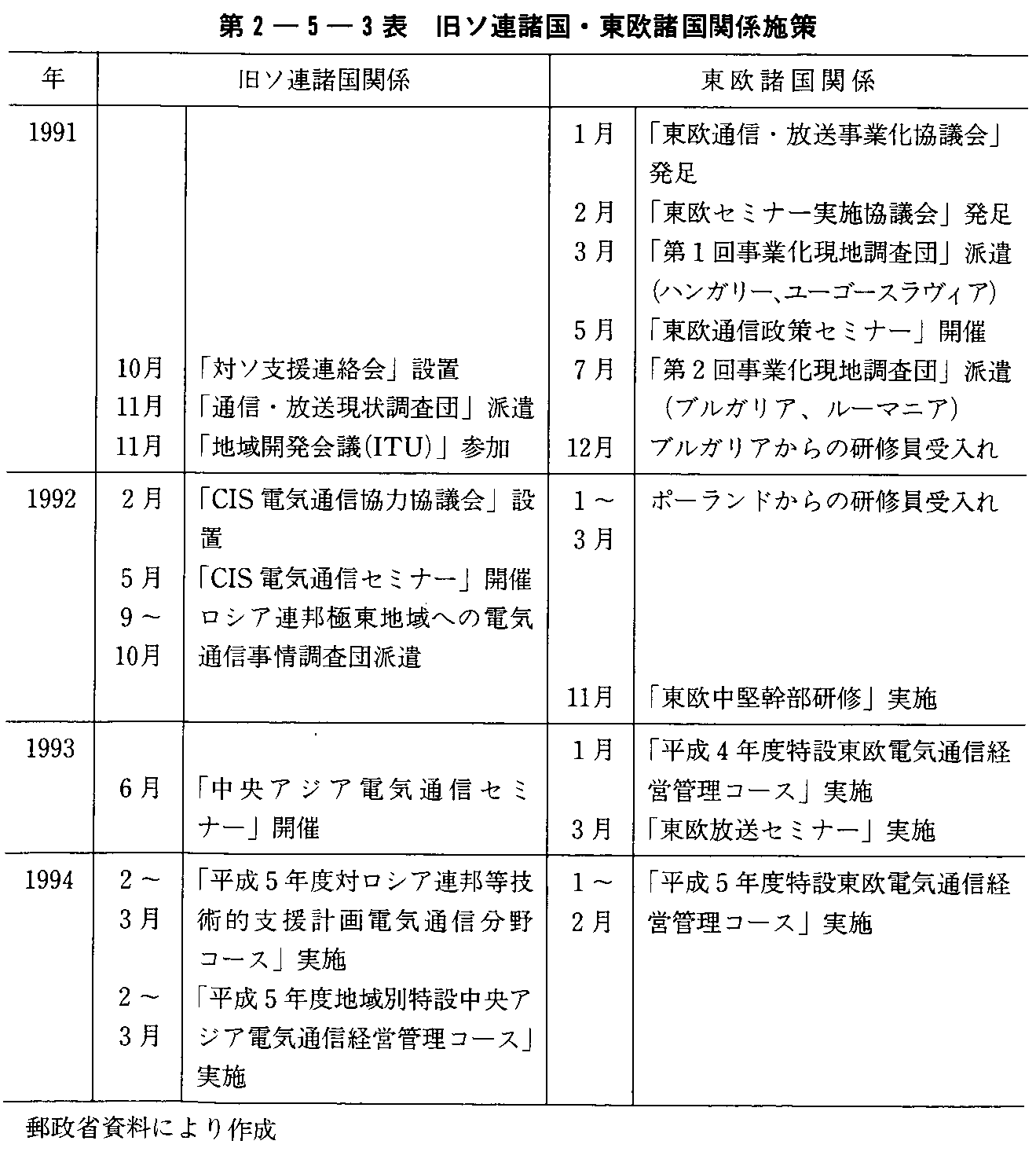 第2章 情報通信政策の動向(3) 旧ソ連諸国及び東欧諸国への支援の強化我が国は、旧ソ連諸国及び東欧諸国の通信・放送分野の発展に貢献するため、視察団の派遣、研修員の受入れ、セミナーの開催等により、同地域への協力・支援体制の整備及び現地事情の調査を行っている(第2-5-3表参照)。旧ソ連諸国に関しては、1993年6月にODAの対象国である中央アジア5か国に対して、タジキスタンを除く4か国から電気通信関係の幹部及び海外からの援助等の受入れ機関の幹部を東京に招へいし、「中央アジア電気通信セミナー」を開催し、我が国の電気通信政策、電気通信網の整備及び技術分野の研究・開発に関するノウハウの提供を行ったほか、1994年2月〜3月にかけて中央アジア5か国の通信関係者を東京に招へいして「中央アジア電気通信経営管理コース」を実施した。 また、ロシアに対しては、1994年2月〜3月にかけて日本政府の技術支援の一環として、「対ロシア連邦等技術的支援計画電気通信分野コース」を実施した。 東欧に関しては、1994年1月下旬に、前年に引き続き「東欧電気通信経営管理コース」を開催した。