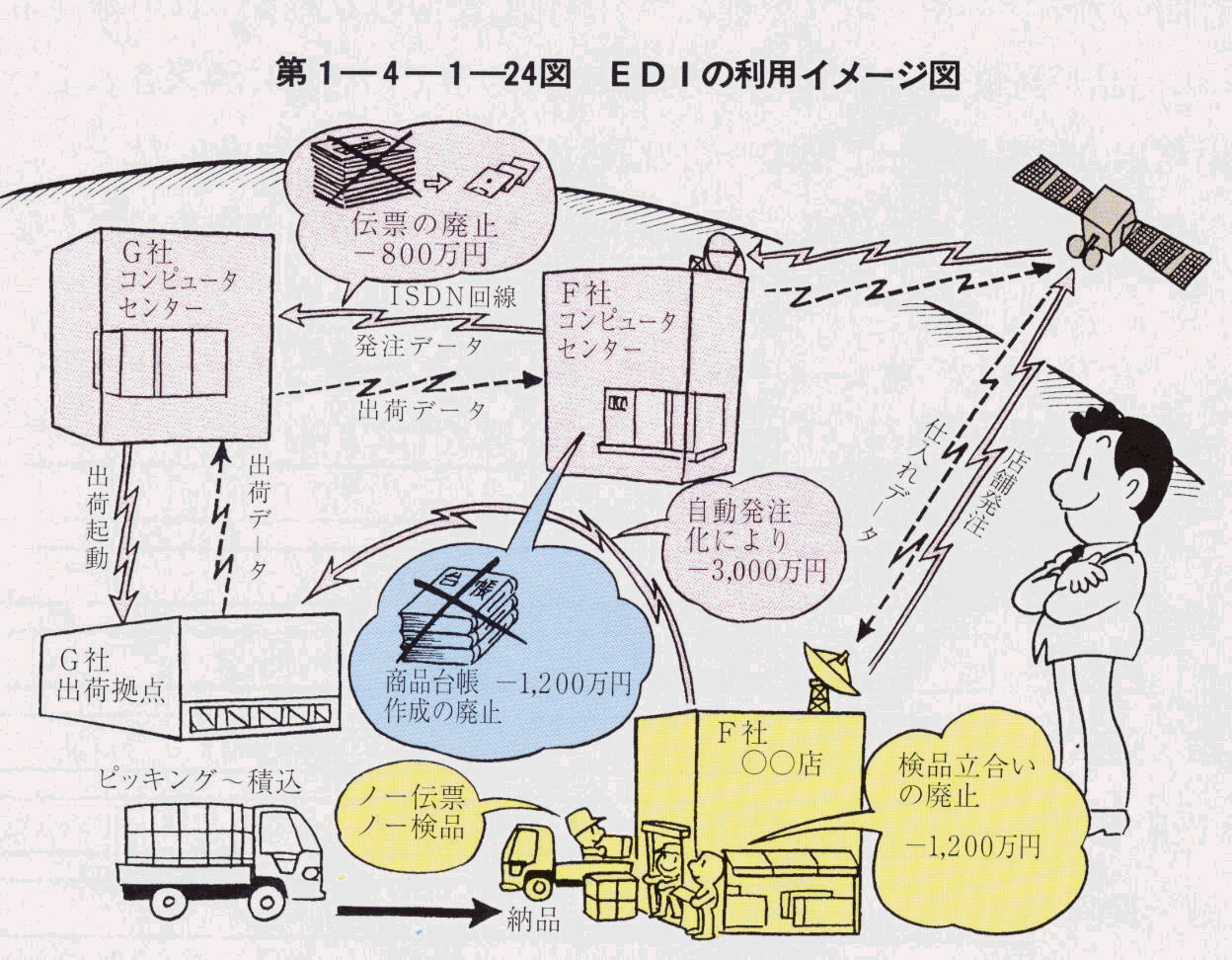 第1部 平成6年情報通信の現況2 産業の情報化産業分野においては、各企業等が業務の迅速化・省力化を図るとともに、高度化・多様化する消費者のニーズへの対応、社内外の情報の有効活用や共有化による競争力強化等を目的として、情報通信の利用を積極的に進めている。 ここでは、我が国の情報化の推移を諸外国の状況との比較を交えて分析するとともに、企業における情報通信利用の動向を、その導入効果の定量的分析を交えて、事例を紹介しながら概観する。 (1) 我が国及び各国の情報化の動向我が国と各国の情報化の進展度を第1-4-1-5表 のデータ項目を利用して比較・分析する(付表6参照) 。 第1-4-1-6図 及び第1-4-1-7図 は、我が国、米国及び英国の昭和60年度及び4年度における情報化の状況を、それぞれの年度の米国の数値を 100として、指数化して示したものである。昭和60年度においては、「ファクシミリ設置台数」以外の点では、我が国の状況は米国に比べ遅れており、特に「パソコン設置台数」については、米国の約4分の1という状況になっている。平成4年度においては、「ISDN回線数」及び「情報サービス産業従事者」において、米国を上回っているが、「パソコン設置台数」については、依然その差が縮まっていない。英国では、「国際通信収入」及び「国際郵便物数」の国際化関連の項目が我が国及び米国に比べて極めて高いことが特徴となっている。 第1-4-1-8図 及び第1-4-1-9図 は、我が国と米国の昭和60年度から4年度までの情報化の推移を昭和60年度を 100として指数化したものである。我が国においては、「携帯・自動車電話加入者数」及び「無線呼出し加入者数」の移動通信系サービス、「ISDN回線数」のデジタルサービス及び「ファクシミリ設置台数」が大きく伸びるとともに、「情報サービス産業従事者」も堅調に伸びている。米国においては、「携帯・自動車電話加入者数」、「ファクシミリ設置台数」が顕著に伸びているが、「無線呼出し加入者数」の伸びは「携帯・自動車電話加入者数」に比較して小さい。また、我が国、米国とも「事務用一般電話加入者数」及び「内国郵便物数」の伸びは他の項目に比べ小さい。 次に各データ項目ごとの主な国の推移について、特徴的なものを選んで概観する。 「携帯・自動車電話加入者数」については、米国の伸びが顕著であり、シンガポールも通話料金の低廉化や地下鉄や構内でも利用できるなどの高い品質により、急激に増加している。英国も3年以降、米国、シンガポールに逆転されているが高い水準にある(第1-4-1-10図参照) 。 「無線呼出し加入者数」については、シンガポールの伸びが顕著であり普及度が極めて高い。これは低廉な料金設定によるものと思われる。我が国は米国に続いており堅調に推移している。英国及びフランスでは、伸び率が低くなっている(第1-4-1-11図参照) 。 「ISDN回線数」については、フランスがサービス開始4年目の2年度にフランス全土をカバーし、積極展開を図ったこともあり、3年度以降伸びが特に顕著であり、急速な進展をうかがわせる(第1-4-1-12図参照) 。 「パソコン設置台数」については、米国は高い水準で伸長しており、英国及びフランスよりも普及が遅れている我が国との差が拡大している状況にある(第1-4-1-13図参照) 。 (2) 企業における情報通信利用の動向ここでは、郵政省の委託調査により実施した企業の情報通信の利用動向調査のヒアリング結果に基づき、業務やサービスの高度化・効率化を図るために、テレビ会議システム、移動通信、衛星通信、電子メール、EDIを導入している企業の事例を、定量的分析を交えて紹介し概観する。 ア テレビ会議システム 企業において、各地から集合して行う会議や社内研修を代替する手段として、テレビ会議を利用するケースが増加している。 テレビ会議システムは、遠隔地の間をISDN回線や衛星通信回線、専用線等で結び、音声と映像を伝送して、遠隔地における会議を支援するシステムで、主に、ビデオカメラ、モニター、マイク、操作卓、書画カメラ、コーデック(画像符号化及び復号化装置)等で構成される。 動画の大量のデータを効率的に圧縮して伝送するための画像符号化技術として、1990年12月に国際標準勧告H.261が勧告化されたことを受けて、各メーカーによる同標準規格を採用した製品の開発が進み、異なるメーカー間の相互接続が可能となり、利用者の利便性が高まることとなった。また、従来、据え置き型が中心だったテレビ会議システムに小型の可搬型のシステムも登場し、価格も大幅に低下したこと、ISDN回線網の普及等の要素が加わり、テレビ会議の利用は拡大してきている。 (テレビ会議の利用事例) テレビ会議システムが利用されているのは、主に複数の拠点から出席者が集まる会議や研修の代替等であるが、顧客との間をテレビ会議で結んで打合せを行ったり、海外の自社の生産・販売拠点や顧客と接続したりする利用も行われている。 OA機器製造業