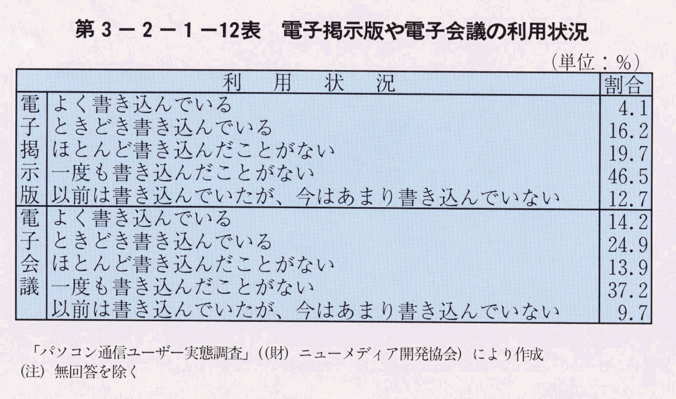 第3部 マルチメディア化と情報通信市場の変革2 情報発信の多元化(1) メディアの多元化地上系・衛星系放送事業者数、ケーブルテレビ事業者数が年々増加し、それに伴い、テレビジョン放送のチャンネル数も増加している(資料2-1 、第3-2-1-8表参照) 。また、書籍や雑誌等の新刊点数も増加傾向にある(第3-2-1-9図参照) 。このような傾向は今後も続くものと考えられる。 (2) 情報の個性化書籍・雑誌等の発行部数は増加しているが、一方、1点、1誌あたりの発行部数は低下傾向にある(第3-2-1-10図参照) 。これは、書籍・雑誌等の内容が、少数の読者や特定地域の読者を対象としたものになっているからと考えられ、情報に対するきめ細かいニーズがあるものと考えられる。 (3) 個人からの情報発信主要パソコン通信ネット局の会員数の増加が著しい(第3-2-1-11図参照)。 このうち、電子掲示板や電子会議などに情報を書き込み、自ら情報発信を行っている会員も少なくない(第3-2-1-12表参照) 。最近では、インターネットを利用して海外に対して情報発信を行う例もみられ、今後は個人による情報発信がさらに増加することが予想される。