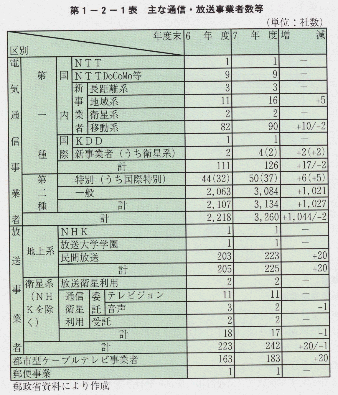 第1章 平成7年情報通信の現況第2節 情報通信経済の動向情報通信経済の動向を、事業者数の動向と経営動向等のそれぞれついて見る。事業者のうち、電気通信事業者(7年度、対前年度比47.0%増)、地上系民間放送事業者(同 9.8%増)及び都市型ケーブルテレビ事業者(同12.3%増)は顕著な新規参入がみられた(第1-2-1表参照)。一方、経営動向のうち、第一種電気通信事業者の電気通信事業営業収益(6年度、対前年度比 7.3%増)、民間放送事業者の営業収益(同 3.3%増)及び郵便事業の収益(同14.0%増)はいずれも前年度に比べて順調に増加している。また、設備投資について、6年度実績額を見ると、電気通信事業者(6年度実績額、対前年度実績額比 2.0%増)は増加している一方で、放送事業者(同18.7%減)は減少している。さらに、7年度修正計画額を見ると、電気通信事業者(7年度修正計画額、対前年度実績額比22.4%増)はさらに増加し、放送事業者(同 1.6%減)は減少しているものの6年度より減少幅は小さくなっている。