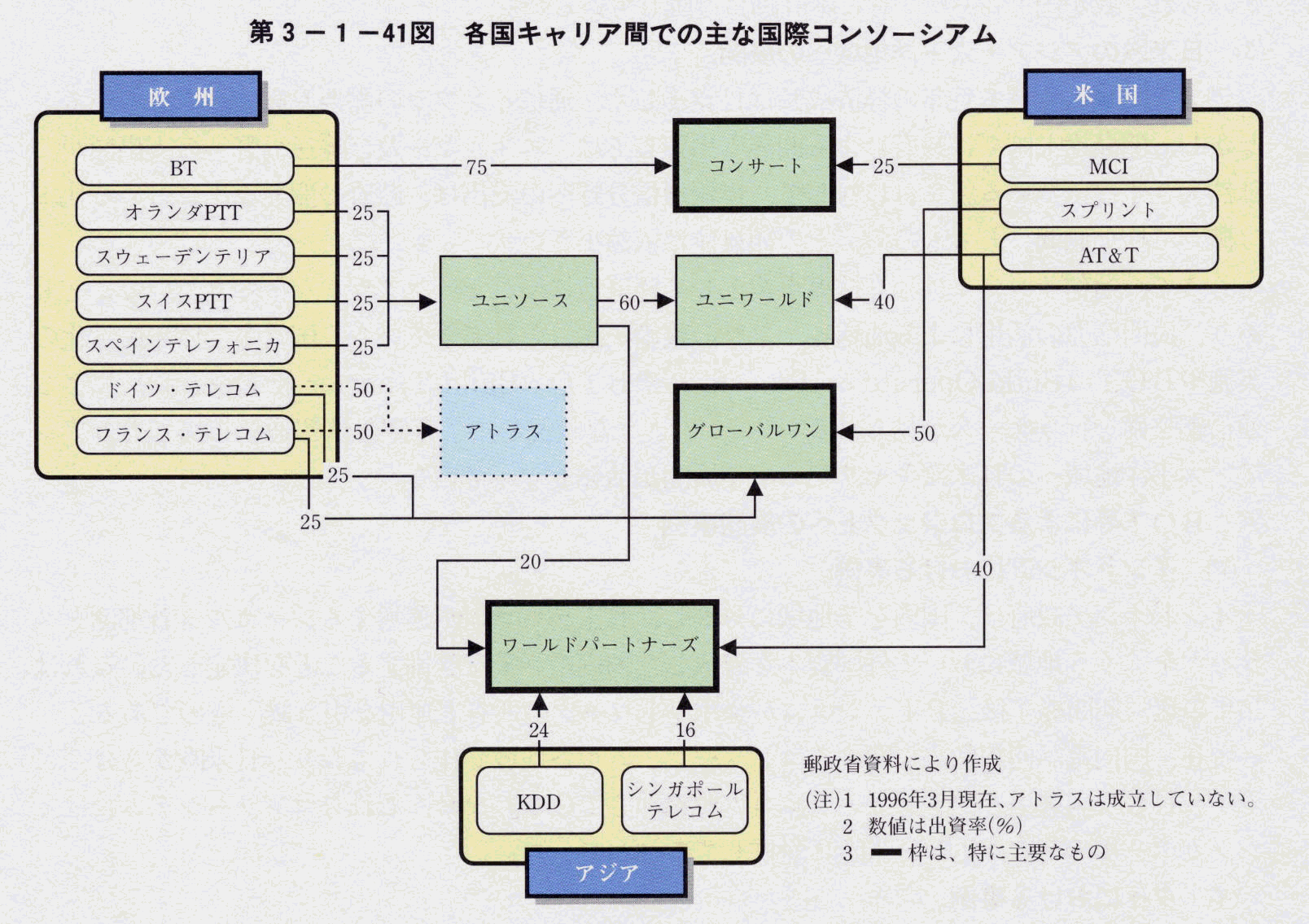 第3章 情報通信が牽引する社会の変革―「世界情報通信革命」の幕開け―(2) 日米欧キャリア間での競争・提携等ア 日米欧キャリア間での国際コンソーシアムの形成 ボーダレス経済の中の激しい国際競争に対応する国際競争力強化のため、各国キャリアはグローバルな戦略的展開を図ろうとしている。そのため、国際間の提携等が活発化してきている。各国キャリア間での主な国際コンソーシアムは、第3-1-41図のとおりである。これらの世界的規模で展開されている各国キャリアによる主要な国際コンソーシアムにおける出資状況をみると、ワールドパートナーズでは、AT&Tが40%を出資し、コンサートには、MCIが25%の出資を行うなど米国企業が活発な出資を行っている。また、英国では、BTがコンサートに75%の出資を行っている。これに対して、我が国が行っている出資は、ワールドパートナーズにKDDが24%の出資を行っているにとどまる。 また、1996年2月、スプリントが50%を出資し、フランス・テレコム及びドイツ・テレコムが各25%を出資しグローバルワンが設立された。 国際間の提携等の動きと各国の政策との関係について見る。BTとMCIのコンソーシアムであるコンサートの計画が1993年に発表された。これに対し、米国司法省は、1996年6月、英国の電気通信市場はフランスやドイツに比べて開放度が高いとして、BTとMCIの提携内容について変更を要求せずに承認を行っている。 また、ドイツとフランスのコンソーシアムであるアトラスは、1993年に計画が発表されたが、1995年7月にEUは、ドイツ及びフランスの電気通信市場が自由化されておらず、両国が自国内の電気通信市場を開放する明確な意思表示をしない限りは設立に反対するとの立場を明らかにしていた。しかし、その後両国が代替インフラの自由化を実施すること等を条件に、EUはアトラスを承認する意向を1995年10月に表明した。 イ その他の日米欧間での競争・提携等 このような国際間の大規模な提携等の動きとともに各国間において注目すべき競争・提携等の動きがみられる。米国の複数のRHCは、英国のケーブルテレビ事業に進出している。ナイネックスは、ナイネックスケーブルコム(1995年1月現在、加入世帯数では英国第3位)に出資し、ケーブルテレビ及び電話サービスの提供を行っている。また、USウエストは、1991年に米国ケーブルテレビ運営会社であるTCIと提携し、テレウエスト(1995年1月現在、加入世帯数では英国第1位)を設立した。 また、ナイネックスは、12億ドルを投じて地中海・インド洋経由で英国から日本までを光海底ケーブルで結ぶFLAG計画を推進している。 米国マイクロソフト社は、インターネットの利用拡大を図るため、インターネットにアクセスできるシステムの共同開発に向けてMCI、NTT、香港テレコム等世界4か国・地域の主要電話会社7社と提携した。 民間国際衛星通信の分野で世界最大の米国パンナムサット社は、1995年11月に我が国の第一種通信事業者の許可を受け、映像伝送サービスの提供を開始した。これまで事実上、KDDが独占していた日本から海外に向けての映像伝送においても競争が開始されることとなった。 非静止軌道を利用した移動体衛星通信サービスの構想が、米国及び欧州を中心に計画されている。低軌道周回衛星(LEO)を利用する米国のイリジウム計画は、1990年に計画が公表され、1998年から商用サービスの開始が予定されている。本計画には、欧州、アジア地域からも参画ががみられ、我が国も1993年7月に本計画に参画している。