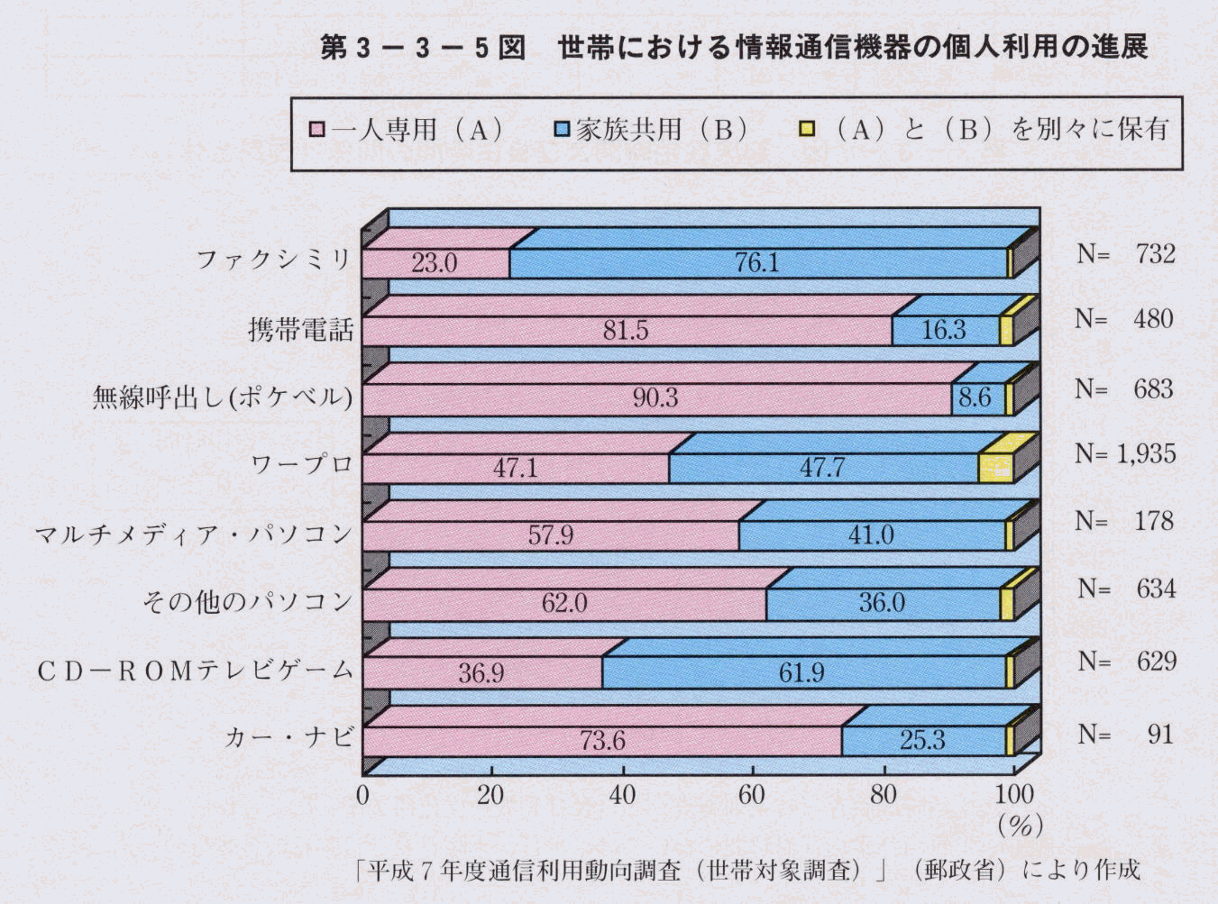 第3章 情報通信が牽引する社会の変革―「世界情報通信革命」の幕開け―1 情報通信の高度化による国民生活の変化(1) ライフスタイルにおける変化ア 家庭における情報通信の利用動向 家庭における情報通信の利用動向について、郵政省の「通信利用動向調査(世帯調査)」及び経済企画庁の「家計消費の動向」に基づき見てみると次のとおりである。(ア) 情報通信機器の普及状況等 家庭における新しい情報通信の利用状況を見るため、最近利用が伸びている情報通信機器の普及状況及び情報通信サービスの利用状況を、2年から7年までの期間について見てみる。 情報通信機器の普及状況として世帯当たり情報通信機器の保有率について見ると、各機器とも増加傾向であり、7年においては、ファクシミリが16.1%(対前年同期比 2.4ポイント増)、無線呼出しは15.0%(同 3.1ポイント増)、パソコンは15.6%(同 2.0ポイント増)及び携帯電話は10.6%(同 4.8ポイント増)となっている。特に携帯電話は、近年、保有率が大幅に増加している(第3-3-1図参照)。また、パソコンの保有率の着実な増加に比べ、パソコン通信の利用率については過去数年間において横ばいである(第3-3-2図参照)。しかし、家庭における今後の利用意向の伸びや、近年の主要な商用パソコンネット会員数の急激な伸び等から、今後、家庭における利用率も増加すると思われる(第3-3-3図〜第3-3-4図参照)。 また、世帯における情報通信機器等の個人利用が進展している。特に個人専用による利用率が高いものは、無線呼出し(90.3%)、携帯電話(73.6%)、カー・ナビゲーション・システム(73.6%)といった移動通信機器が多くなっている(第3-3-5図参照)。 (イ) 利用時間 情報通信メディアの利用動向を見るため、他のメディアを含めて、各メディアの一日当たり国民全体の平均利用時間を、昭和45年から7年までの期間について5年間隔で見てみる。 テレビ、ラジオ、本・雑誌・マンガ、レコード・CD・テープ及びビデオの利用時間の和を、メディアの総利用時間として見てみると、昭和60年に減少している以外は、その前後ではいずれも増加傾向である。特に7年の総利用時間は 302分となり、昭和45年以降では最も長くなっている(第3-3-6図参照)。 各メディアの一日当たり平均利用時間が増加しているのは、食事や仕事等、その他の行動と同時にメディアに接触している場合の「ながら」利用の増加が要因の一つであると思われる。また、起床在宅時間は減少しているにもかかわらず、自由時間が増加していることから、携帯型端末の普及等により、外出先においても活発に情報収集が行われていることも要因となっていると推測される(第3-3-7図参照)。 メディアごとの利用動向を見てみると、利用時間としては常にテレビの利用時間が圧倒的に長くなっているが、近年、ビデオ、レコード・CD・テープの利用が伸びてきている。後者のメディアの特徴は、利用者が個人の好みに合ったソフトを選ぶことができるところにあり、人々の情報に対するニーズの多様化を示している。テレビの利用時間についても、昭和60年にいったん減少した後、再度増加傾向に転じている。これは、昭和62年、衛星放送による独自番組の放映が開始されたことや多チャンネル放送を行う都市型ケーブルテレビの登場等により、テレビが人々の情報に対するニーズの多様化を満たすメディアとして再び支持を得たことを反映したものとも推測される。 イ 情報通信の高度化による新しいライフスタイル (ア) 新しいライフスタイルの進展状況(テレワークによる新しいライフスタイル) 最近では、電子メールやパソコン通信等の情報通信を利用し、事務所に通勤するかわりにサテライトオフィスでの勤務や在宅勤務等が可能となる「テレワーク」という勤務形態を導入する例が見られるようになってきている。 テレワークにより、個人の都合に合わせた働き方が可能となり、個人のプライベートな生活において時間的な余裕が生まれるばかりでなく、移動が困難であったり、長時間の拘束に対応できないために就労が阻害されていた、主婦や高齢者等の社会参加が実現し、新しいライフスタイルが進展しつつある。 テレワークの先進国たる米国のある実証研究等の成果によれば、テレワークの普及は、社会全般に対して様々な波及効果を及ぼすことが想定されると結論付けている。例えば、テレワークの普及により、労働者に対しては、主体的に時間管理を行うことができる度合いの増大、通勤に伴うストレスからの解放等、企業に対しては、生産性・従業員の労働意欲の向上、経営コストの削減等、社会全般に対しては、交通問題の解消、エネルギー・環境問題への貢献等の効果があるとしている。 (テレワークの現状等) (社)日本サテライトオフィス協会の「日本のテレワーク人口調査研究報告書」(8年2月)によると、我が国で何らかの形でテレワークを実施している人口は、約95万人と推定されている。さらに、郵政省郵政研究所が7年度に実施し