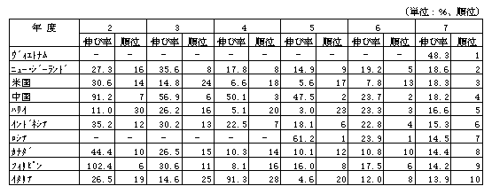 また、国際ダイヤル通話サービスの発信時間数の対前年度伸び率について見ると、5年度が10.8%、6年度が8.8%、7年度が9.9%となっており、近年、減少傾向にあった伸び幅が再び増加に転じた。7年度の対前年度伸び率の上位10位までの地域について、2年度から7年度までの順位の推移を見ると、ニュー・ジーランド、カナダは6年度に引き続き順位を上げているほか、これまで上位に入ったことのなかったヴィエトナムが1位となっている。また、6年度においては上位10位に入っていない米国が、7年度においては3位となっている(第1-1-34図参照)。