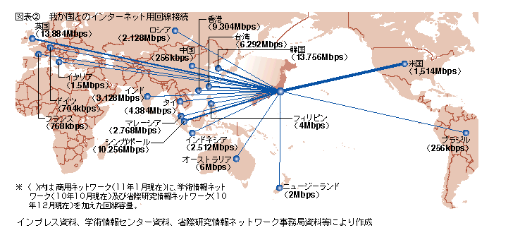 (1)インフラストラクチャー トラヒックの増加に伴い国内、国際を問わず回線増強が急務 我が国と諸外国間におけるインターネット用回線容量について、商用インターネットベースでみると、11年1月現在の回線総容量は1,430Mbps(対前年同期比37.2%増)であり、年々増加している。いずれの年においても、対米国が回線総容量の約95%を占めており、米国はインターネットにおけるハブ的存在となっている。また、日本と米国間の回線総容量は10年1月が対前年同期比119.5%の伸びであるのに対し、11年1月は対前年同期比35.5%増にとどまった(図表1))。インターネット利用者の増加やマルチメディア化の進展に伴い、インターネットの高速化を求める声が高まる中、ISPは回線容量の増強や国際間の接続といった、様々な回線確保への対応を求められているが、米国との間では海底ケーブルの容量不足が徐々に影響してきており、回線容量の確保に苦慮しているものと想定される。 一方、米国以外の国及び地域との接続については、11年1月における回線総容量で対前年同期比74.7%増となっており(図表1))、11年1月現在19の国及び地域に接続している(図表2))。 最近のインターネット用回線の主な整備状況としては、KDDが、10年9月に日米間の回線を135Mbpsから245Mbpsに拡大したほか同年6月にフランス、同年9月にロシアやニュージーランド等これまで直接接続していなかった国に対しインターネット用回線をそれぞれ新設した。また、11年3月にIDCが日米間に155Mbpsの回線を新設し、総容量245MbpsとKDD並の容量となった。 国内においては、各ISPが回線確保のため相互に接続しトラヒックを交換するIX(Internet Exchange)の利用が著しい。最も中核的なIXであるNSPIXP2(http://xroads.sfc.wide.ad.jp/NSPIXP)や商用IXであるJPIX(http://www.jpix.co.jp/)のインターネットのトラヒックは、いずれも1年前の倍以上のペースで伸びている(図表3)、4))。各IXにおいては、接続回線容量の増加が著しく(図表5))、また、東京-大阪間のインターネット用回線総容量も、11年1月は前年同期と比べて約3倍に伸びており(図表6))、インターネット用回線の増強が急速に進められている。 今後、数十〜数百Gbpsの伝送容量の光海底ケーブルが敷設される予定(2-3-1参照)であり、また、現在T(テラ)(1012)bpsクラスの高速伝送技術の研究が行われているところであるが、現段階のトラヒックの伸びを考慮するとTbpsクラスの基幹網の敷設とP(ペタ)(1015)bpsクラスの高速伝送技術の研究が必要になるのは時間の問題であると考えられる。 ![]() ![]() ![]() ![]() ![]() ![]()