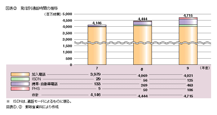 ISDNの発信通話回数及び通話時間が前年に比べ急激に増加 9年度の総トラヒックは1,169億回で、対前年度比7.1%増となっている。 その内訳を見てみると、加入電話からの発信通話回数は919.0億回(対前年度比2.9%減)と減少しているのに対し、ISDN、携帯・自動車電話及びPHSは、それぞれ36.5億回(同126.9%増)、174.5億回(同58.9%増)、38.6億回(同104.3%増)と増加した。 また、総通話時間は47.2億時間で、対前年度比6.1%増となっている。 これを発信別にみると、加入電話からの通話時間は40.2億時間で、対前年度比1.2%減であるのに対し、ISDN、携帯・自動車電話及びPHSは、それぞれ1.3億時間(対前年度比123.2%増)、4.6億時間(同72.1%増)、1.1億時間(同112.0%増)と、急激な伸びを示している。 ![]() ![]()