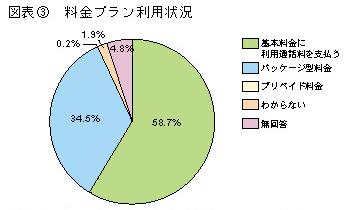 「生活の情報化調査」によれば、月額の利用料金については、携帯電話は「5,000〜10,000円未満」が最も多く、43.7%を占めているのに対し、PHSは「5,000円未満」が55.6%を占めている(図表1))。 実際に利用料金がどこから支払われているかについては、「家計」が44.6%で最も多く、次いで「個人のこづかい」が37.2%である。これを年齢別にみると、10代、20代の若年層では「個人のこづかい」が50%以上を占めているが、それ以外の年代では「家計」で支払いを負担していることが多い(図表2))。 どのような料金プランを利用しているかについては、「基本料金に利用通話料を支払う」が58.7%を占めている。また、基本料金と一定の通話料金があらかじめ含まれている「パッケージ型料金」は34.5%となっている(図表3))。 割引サービスの利用状況についてみると、携帯電話又はPHS利用者のうち37.2%が、長期継続利用契約をすると、基本料金が割り引かれるサービスである「年間割引」を利用している。一方、割引サービスを「利用していない」人は33.6%いる状況である(図表4))。 なお、11年度中も各事業者から様々な新割引サービスが提供された(資料3参照)。 ![]() 「生活の情報化調査」により作成