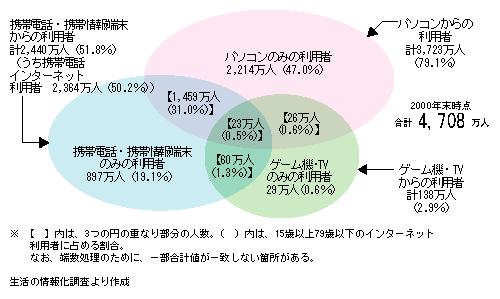 インターネット利用者は4,708万人、対前年比74%増加 インターネットの高度利用をもたらすブロードバンド化を論じるに当たり、最初に、その前提となるインターネットの利用状況として、インターネット利用の現況及びインターネット接続サービスの現況について概観する。 1)インターネット利用の現況 現在の我が国におけるインターネット普及の現況をみると、平成12年末における我が国の15歳以上79歳以下の個人におけるインターネット利用者数は4,708万人と推計され(注1)、平成11年末段階の推計値と比較すると74.0%増となっている(ただし、平成11年末までは15歳以上69歳以下の利用者数推計としており、対象範囲が異なるため厳密な比較ではない。)。また、平成17年(2005年)におけるインターネット利用者数を推計したところ、8,720万人まで増加するものと見込まれる(注2)。なお、ここでは、「インターネット利用者」を、「インターネット(ウェブ又は電子メールのどちらかのみの場合も含む。)を、自宅・自宅外を問わず、パソコン、携帯電話、携帯情報端末、家庭用ゲーム機、インターネット接続機器を設置したテレビ受像機により利用している人」と定義している。 さらに、総務省が行っている通信利用動向調査によれば、平成12年11月におけるインターネットの世帯普及率は34.0%、事業所普及率は44.8%、企業普及率では95.8%となっており、順調に増加している。 また、個人のインターネット利用の現況について、その利用の態様別に分析すると、以下のとおりである。 インターネット全体について ○接続端末別 パソコンによるインターネット利用者数は3,723万人であり、携帯電話・PHSからの利用者数は2,364万人となっている。パソコンの出荷台数の増加にともない、パソコンからのインターネット利用者数は順調に増加しているが、それに加えて、平成11年2月より開始された携帯電話・PHSからの利用者数の急激な伸びがインターネット利用者の増加に与える押し上げ要因となっている(図表2))。 ○利用頻度別 インターネット利用者の利用頻度についてみると、何らかの端末から「ほぼ毎日」インターネットを利用している人は2,593万人であり、これはインターネット利用者全体のおよそ55%にあたる。残りの45%は、「週に数回程度」又は「月に数回以下」の利用者である(図表3))。 自宅のパソコンからのインターネット利用について ○回線別 自宅のパソコンからインターネットを利用している人について、利用しているアクセス回線の種別をみると、アナログ回線を利用している人が過半数(50.2%)であり、次いで、ISDNによるダイヤルアップ接続(34.0%)、ISDNによる常時接続(東・西NTTのフレッツISDN)(7.4%)となっており、この3つで90%を占めている(図表4))。 ○利用場所別 パソコンからのインターネット利用者の利用場所についてみると、「自宅から」の利用者が最も多く3,066万人、職場からの利用者が1,285万人、学校からの利用者が372万人となっている(図表5))。 2)インターネット接続サービスの現状 インターネット利用者の増加にともなって、インターネット接続サービス事業者(インターネット・サービス・プロバイダ:ISP)も着実に増加している。 我が国におけるISP数(総務省への届出数)は、平成12年末現在で合計5,612事業者となった(図表6))。 ISPのほとんどは、回線を所有する事業者から回線を借り受けてサービスを行う第二種電気通信事業者であり、同年度末には特別第二種電気通信事業者が47事業者、一般第二種電気通信事業者が5,363事業者となり、更に増加が続いている。一方、自ら回線を所有してサービスを行うISP(第一種電気通信事業者)についても、平成12年度1年間で92事業者から202事業者へと倍増している。 第一種電気通信事業者の急増の大きな要因に、インターネット接続サービスを提供するケーブルテレビ事業者の参入が挙げられ、昨年1年間で新たに112社がインターネット接続サービスを開始している。 3)各国・地域のインターネット普及状況 世界のインターネット利用者数は、この数年急激な増加を続けている。NUA社が公表している推計によれば、2000年11月現在のインターネット利用者数は約4億710万人に達している(図表7))。 その内訳をみると、北米が最も多く1億6,712万人(41.1%)、以下欧州が1億1,314万人(27.8%)、アジア・オセアニアが1億488万人(25.8%)と続いている(図表8))。また、国別の利用人口でみると、米国が1億5,384万人、次いで我が国の4,708万人となっている。 各国・地域における人口に対するインターネット利用者の割合を見ると、25%を超えているのは21の国及び地域となっている(図表9))。スウェーデン、米国、ノールウェー、アイスランドの4か国は既に50%を超えており、以下、香港、デンマーク、オランダと続き、日本は第14位となっている。全体的に、北欧と北米における普及率が高いが、アジア各国・地域も上位に入ってきている(注3)。 図表1) 我が国におけるインターネットの普及状況