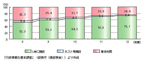 国の行政機関内のネットワーク化が進展 政府では、行政部門全体として総合的な情報化を推進するための共通基盤として、パソコン等の情報機器、LAN、省庁内ネットワークを整備するとともに、霞が関WANを活用し、行政部門における横断的な行政情報通信ネットワークの整備を推進している。 1)パソコン設置・LAN接続状況 「行政情報化推進基本計画の改定について」(平成9年12月20日閣議決定)では、行政情報化推進のための基盤整備の一環として「地方支分部局等を含め、引き続き、必要な職員へのパソコン1人1台の配備を進める」としている。本省庁におけるパソコン1台当たりの職員数の状況をみると、平成11年度に1.0人と「1人1台パソコン」を達成しており、12年度には0.9人となっている。また、国立大学を除いた国の行政機関全体の状況をみると、平成8年度の2.8人から平成12年度には1.4人になるなど、パソコンの整備が着実に進展していることが分かる(図表1)、資料4参照)。 また、設置されたパソコンは、文書作成等の単体利用のみならず、ネットワーク接続端末としても活用されている。国の行政機関全体におけるパソコンのLAN接続率の推移をみると、LAN接続率は平成8年度の52.3%から年々高まっており、平成12年度には設置されたパソコンのおよそ3/4がLANに接続されている。一方、単体で利用しているものは平成8年度の42.3%から平成12年度の24.4%へと半分近くにまで比率が低下してきている(図表2))。 2)ネットワーク構築状況 「行政情報化推進基本計画の改定について」では、「引き続き、LANの整備を進める」こととしており、国の行政機関における省庁内ネットワーク基盤の高度化を推進している。国の行政機関における主要システム(注)数は、平成7年度から12年度にかけ、2倍以上に増加している。中でもLANシステム数の増加は著しく、平成12年度には主要システムのうち、94.2%を占めるにまで至っている(図表3))。 また、国の行政機関においては、平成9年1月から各省庁のLANを結ぶ省庁間ネットワークとして、霞が関WANの運用を開始している。霞が関WANは、省庁間の情報交換の円滑化を図るため電子メールシステムや省庁間電子文書交換システムを運用するほか、国会関係事務支援システム、共通情報検索システム、総合統計データベース等情報共有の高度化等を図るため各省庁が整備・運用するシステムの通信基盤となっており、現在全省庁を含む28の機関が利用している。 3)ネットワーク活用状況 政府では、1人1台パソコンの整備、LAN導入などの情報化を推進しているところであるが、このような情報通信基盤が十分に活用されていないこと等から紙を中心とした事務処理が残存し、意思決定の迅速化、事務の簡素化・効率化等の行政の情報化が指向する効果が十分に現れていない状況もみられる。そこで、政府では「バーチャルエージェンシーの検討結果を踏まえた今後の取組について」(平成11年12月28日高度情報通信社会推進本部決定)に基づき、行政事務のペーパーレス化(電子化)を進めており、平成14年度までに、国の行政機関における内部事務のうち、「連絡・通知」及び「情報共有」を主眼とする事務など57事務についてペーパーレス化(電子化)を実現することとしている。職員1人当たりの媒体別情報保管量の推移をみると、紙によるものが平成11年度から2年連続で減少している一方、電子媒体によるものは平成7年度の3.6倍と大幅に増加している(図表4))。 図表1) パソコン設置台数とパソコン1台当たり職員数の推移