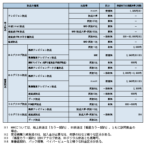 (9)放送料金 NHKは受信料、民間放送は広告収入・有料放送料金が財源 地上放送及び衛星放送における受信料及び料金の体系については、平成13年4月末現在において、図表のとおりとなっている。 このうち平成12年12月に新たに放送サービスを開始したBSデジタル放送に関しては、NHKは現在のところ特にそのための受信料区分を設けておらず、従来の「衛星カラー契約」による受信が可能となっている。また、民間放送についてもBSアナログ放送における契約料金とほぼ同水準となっており、BSデジタル放送の円滑な普及に向けて配慮された形となっている。 図表 放送の料金体系(平成13年4月現在)