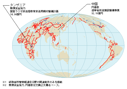 開発途上国に対する我が国の貢献 情報通信は、経済の発展、雇用の拡大、国民生活の向上等をもたらすインフラとして、大きな期待を寄せられており、開発途上国を含めた地球規模での情報通信ネットワークの整備の必要性が高まってきている。 しかしながら開発途上国においては、人口100人当たりの電話普及率が1台にも達しない国が未だに40か国程度存在しているのが現状であり、今後、IT革命の進展にともない国際的なデジタル・ディバイドの拡大が懸念されている。 総務省では、これらに対応すべく外務省、国際協力事業団(JICA)、国際協力銀行(JBIC)と協力し、ODA(政府開発援助:Official Development Assistance)を通じた開発途上国における情報通信分野の継続的な発展に貢献している(図表1)、2))。 また、2000年7月に森総理大臣(当時)が表明した、我が国としてのIT分野における包括的協力策や、九州・沖縄サミットで採択されたIT憲章及びAPTアジア太平洋情報社会サミットの「東京宣言」を踏まえ、国際的なデジタル・ディバイド解消に向けた一層積極的な取組が期待されている。 図表1) 資金協力の実施状況(2000年度署名分)