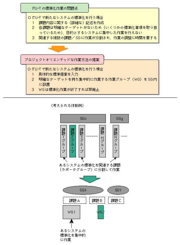 −標準化作業の迅速化 情報通信分野の国際標準化では、国際電気通信連合(ITU:International Telecommunication Union)が中核的な役割を果たしている。ITUにおいては、電気通信標準化部門(ITU-T:ITU Telecommunication Standardization Sector)及び無線通信部門(ITU-R:ITU Radiocommunication Sector)が標準化活動を行っている。 (1)ITU-Tにおける取組 ITU-Tでは、情報通信環境を取り巻く急速な変化に対応した迅速な標準化作業(勧告の策定)を行うため、作業方法の見直し等が進められているところである。2000年9〜10月に開催された、ITU-Tの活動の方向性を決める会議である世界電気通信標準化総会(WTSA-2000:World Telecommunication Standardization Assembly-2000)において、それまで勧告の承認手続だけでおおむね9か月程度を要していた状況を改善するため、規制又は政策への影響を伴わない勧告については、研究委員会(SG)会合を開催せずに電子的な手段(電子メール、ウェブ等)を活用して、迅速な勧告承認を可能とする「代替承認手続き」(AAP:Alternative Approval Process)の導入が決定した。AAPの導入により、ほとんどのITU-T勧告の承認手続に要する期間を2〜3か月程度に短縮することが可能となっている。また、市場ニーズに対応した迅速な標準化作業を行うため、目標となるシステム案をきっかけに速やかに作業を立ち上げ、短期的・重点的に標準化を行うプロジェクトオリエンテッドな作業方法を、我が国より提案しており検討がなされている(図表)。 また、ITU-Tは、他の標準化機関等との積極的な連携を進めており、例えば、インターネットの標準作成フォーラムであるIETF(Internet Engineering Task Force)やIMT-2000の標準化作業を行っている3GPP/3GPP2(Third-Generation Partnership Project/Third-Generation Partnership Project2)において作成された標準を勧告策定の際に参照し、標準化作業の重複を避けるとともに迅速化を図っている。 (2)ITU-Rにおける取組 ITU-Rでは、無線通信規則の改正、無線通信の技術・運営等の問題の研究や勧告作成及び周波数の割当・登録などを行っている。現在、ITU-Rでは、技術分野ごとに、周波数管理(SG1)、電波伝搬(SG3)、固定衛星業務(SG4)、放送業務(SG6)、科学業務(SG7)、移動等業務(SG8)、固定業務(SG9)の7つの研究委員会(SG)を設置して無線通信に関する技術的検討を進めており、また、ITU-Rの作業の優先順位及び戦略等の見直し、作業計画の進捗状況の評価を行う無線通信アドバイザリグループ(RAG)を設置してITU-R全体の作業方法の改善を行っている。 ITU-Rにおける活動に対して我が国は、1名のSG議長及び3名のSG副議長をはじめ数多くの役職を引き受けるとともに、勧告作成に向けて多数の寄与文書を提出し、SG等会合に多数の専門家が出席している。 我が国における最近の主な取組としては、2001年10月に東京にて開催された第6回WP8F会合(SG8)において、我が国の提案したIMT-2000の高度化及び後継システムの基本コンセプトを基に議論を進めることで合意されたほか、我が国のDSRC(DSRC:Dedicated Short Range Communications、狭域通信)方式をASTAP9か国の共同提案としてWP8A(SG8)に提出した結果、これを基に作成された新勧告案が2001年11月に開催されたSG8会合において採択された。また、2001年10月にジュネーブ(スイス)で開催されたSG6会合においては、地上デジタルテレビジョン放送のプランニング基準の勧告に日本方式(ISDB-T)のプランニングパラメータを追加することが決定されるなど、技術的検討に積極的に貢献しているところである。 今後の対応としては、WRC-2003(世界無線通信会議、2003年6月開催予定)の準備会合であるCPMの第2回会合(2002年11月開催予定)に向け、各SG・WP等における技術的検討等の活動に積極的な寄与・貢献を行っていく。 図表 ITU-Tにおける取組