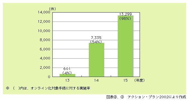 ![]() また、そのために必要な法制面の環境整備を行う行政手続オンライン化法をはじめとする行政手続オンライン化関係三法も平成14年12月に成立し、そのうち行政手続オンライン化法及び同法の整備法(一部を除く。)は、平成15年2月に施行されたところである(3-5-3(1)参照)。 平成14年8月には、電子政府・電子自治体のための基礎インフラとなる住民基本台帳ネットワークシステムが稼動し、平成15年8月の住民基本台帳カード交付に向けて、準備を進めている。平成14年9月には、政府全体としての情報化の推進体制をより強固なものとし、行政の情報化等を一層推進するため、高度情報通信ネットワーク社会推進本部の下に各府省の情報化統括責任者(Chief Information Officer)を構成員とする「各府省情報化統括責任者(CIO)連絡会議」が設置された。同会議では、国民の利便性・サービスの向上、IT化に対応した業務改革に重点的に取り組んでおり、平成15年3月に、新たな電子政府構築のための基本方針を決定したところである。今後、この方針に基づき、平成15年6月を目途に「電子政府構築計画」(仮称)を取りまとめることとしている(3-5-3(3)参照)。 2 電子政府の推進 (1)国民・企業と国との間のオンライン化の状況 電子政府・電子自治体は、すべての国民や企業が行政サービスを時間的・地理的な制約なく享受することを可能とし、快適・便利な国民生活や事業活動を実現するとともに、業務改革や手続の簡素化・合理化と連動することにより、行政運営の簡素化、効率化及び透明性の向上にも寄与する。 政府は、これまで、行政手続のオンライン化、行政情報へのアクセスの改善に取り組んできている。 行政手続のオンライン化については、全府省において、平成14年度末までに必要となる認証システム、汎用受付等システムの整備を完了したところであり、また、国の行政機関が扱う手続については、平成14年度末までに7,335件(実施率54%)、平成15年度末までに13,299件(実施率98%)の手続がオンライン化されることとなっている(図表3))。 また、通関、検疫、入出港等の輸出入・港湾関連手続、車検・登録、車庫証明、納税等の自動車保有関係手続等、複数の府省や地方公共団体に関係する手続を一度の手続で行えるようにするワンストップサービスの取組も進めている。特に、輸出入・港湾関連手続については、関連システムを相互に接続・連携により、1回の入力・送信で関係府省に対するすべての必要な手続ができるシングルウィンドウ化を平成15年7月中を目途に実現する予定となっている。 図表3) 国の行政機関が扱う申請・届出等手続のオンライン化件数(累計)