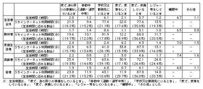 における平日の生活時間、そのうちのインターネットの平均利用時間(分)を把握し、各生活場面において、インターネットを利用している人のインターネット利用平均時間と生活時間における割合を算出した。