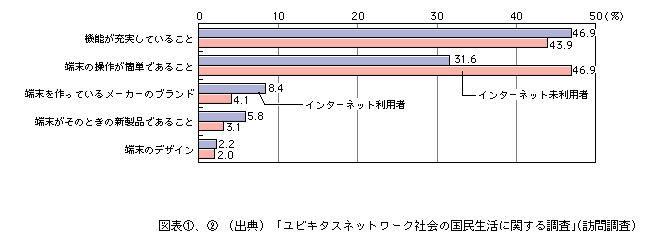 ![]() インターネットを利用する際に、ネットワークへの接続起点となる情報通信機器については、インターネットの利用者・未利用者とも、「機能が充実していること」(利用者46.9%、未利用者43.9%)や、「端末の操作が簡単であること」(利用者31.6%、未利用者46.9%)であることを重視している(図表[2])。インターネットの利用・未利用にかかわらず、個人の利用用途や都合に応じた多様な機能を、過度な負担なく、誰もが簡単な操作で便利に利用できるネットワークの利用環境が望まれている。 図表[2] インターネットに接続する情報通信機器について重視する項目(複数回答)
