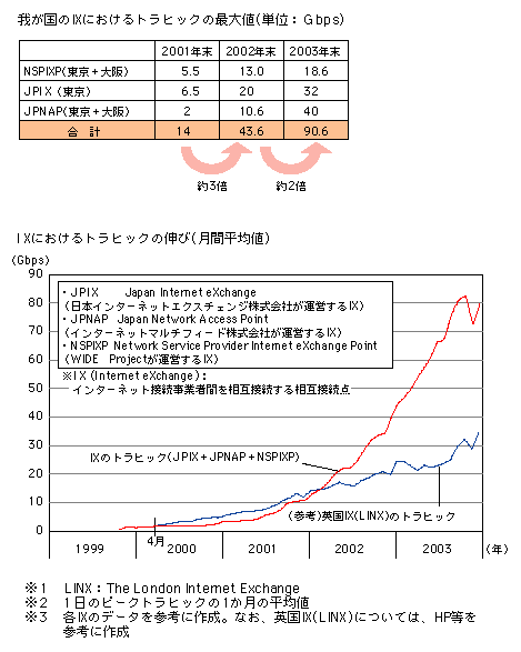 インターネット・インフラ政策の新たな展開 我が国では、これまでの競争政策や振興政策の推進により、DSL加入者は1,000万人を超え、家庭向け光ファイバ(FTTH)サービス加入数は100万契約を超えるなど、世界で最も高速かつ低廉な料金によるブロードバンドサービスが進展している。ブロードバンド利用者の増加に伴い、アクセス網における通信量(トラヒック)も急増しており、今後、電子政府、遠隔医療及び遠隔教育等のネットワークの高度利用が進展するに伴い、アクセス網、さらにはそれを支えるバックボーン回線のトラヒックがより一層増加することも予想される(図表)。] 図表 IXにおけるトラヒックの増勢傾向