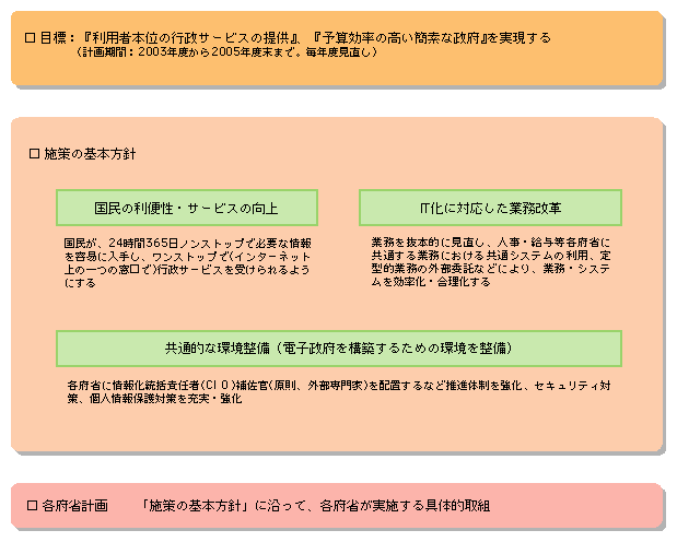 (1)国民の利便性・サービスの向上 利用者の視点に立った行政サービスの提供 政府は、平成15年7月、各府省情報化統括責任者(CIO)連絡会議において、平成15年度(2003年度)から平成17年度(2005年度)までの3か年を計画期間として、電子政府構築に係る政府の具体的な取組を定めた「電子政府構築計画」を決定し、同計画に基づき、国民の利便性・サービスの向上とIT化に対応した業務改革に取り組んでいる(図表)。 同計画に基づく取組の一環として、平成16年1月、各府省が提供している行政情報の総合的な検索機能や行政手続の案内、法令データ等の検索機能を提供する政府のポータルサイト「電子政府の総合窓口(e-Gov)」(http://www.e-gov.go.jp)の機能を見直し、ライフイベント(結婚、就職等)別の手続案内の導入、各府省の組織・業務内容、パブリックコメント(意見募集及び結果公表)の統一的な提供等、利便性・サービスの向上を図った。 また、各府省において策定した「行政手続等の電子化に関するアクションプラン」に沿って手続きのオンライン化を進めた結果、平成15年度末までに、国の行政機関の扱う申請・届出等手続のほとんどすべてについてオンライン化を実施した。 これらの取組をより一層推進し、さらなる利便性の向上につなげるため、平成16年3月、CIO連絡会議において、行政情報の電子的提供、電子申請等受付にかかわるシステムの利便性の向上及び効率的な整備を図る観点から、「行政ポータルサイトの整備方針」を策定し、インターネットによる行政情報の提供の充実、e-Govを活用した手続きのワンストップサービスを平成17年度末までに実施することとしている。 図表 電子政府構築計画概要