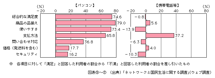 ![]() ネットショッピングの満足度は、米国、韓国とも日本と同様、パソコンは高く、携帯電話等はパソコンに比べ低くなっている(図表[15])。 図表[15] ネットショッピング利用者の満足度