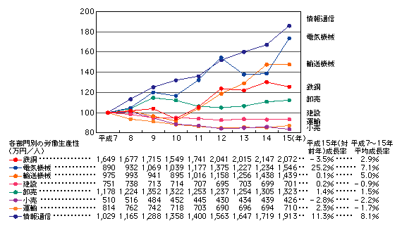 ![]() 2 労働生産性の産業別比較 平成15年の情報通信産業の労働生産性(付加価値額÷雇用者数)は、鉄鋼の2,072万円に次ぐ1,913万円となっている。また、情報通信産業の労働生産性は平成7年以降一貫して伸びており、平成7年から15年における年平均上昇率は、8.1%である(図表[2])。 図表[2] 産業別労働生産性の推移(平成7年を100として指数化)