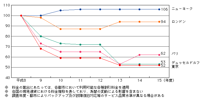我が国は低廉化が最も進むものの、国際的にはなお高い水準 各国主要都市の国内専用線料金について、OECDモデル(注)で比較すると、デジタル1.5Mbpsでは平成8年度から15年度にかけて、東京は他の都市と比べ最も通信料金の低廉化が進んでいる(図表[1])。しかしながら、個別の国内専用線料金では、デジタル1.5Mbps(50km)では、東京の国内専用線料金は、ジュネーブに次いで高い水準となっている(図表[2])。 図表[1] OECDモデルによる国内専用線料金(デジタル1.5Mbps)の推移(平成8年度を100として指数化)