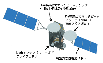 ![]() 2 超高速インターネット衛星の研究開発 総務省では、広域性・同報性・耐災害性等といった衛星の特長を積極的に活用した地上のインターネット網と相互補完する超高速衛星通信技術の確立、アジア・太平洋地域諸国との国際共同実験の実施等を目的として、最大1.2Gbpsの広帯域通信が可能となる超高速インターネット衛星(WINDS:Wideband InterNetworking engineering test and Demonstration Satellite)の研究開発を文部科学省と連携して推進している。超高速インターネット衛星は、平成19(2007)年度に打上げの予定である(図表[2])。 図表[2] 超高速インターネット衛星の概念図