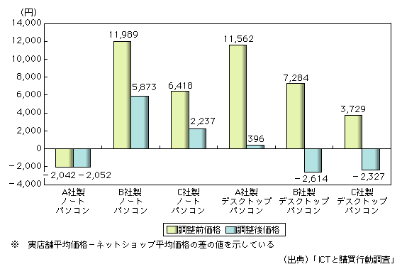 電子商取引では、市場メカニズムがより有効に機能するのではないかという期待が存在する8。この仮説が正しければ電子商取引市場の価格は通常市場の価格よりも低い水準となることが期待される。 ネットショップと実店舗の名目表示価格9を比較してみたところ、ネットショップ表示価格は実店舗の表示価格よりも低い水準となっていた10(図表1-8-10)。特に、価格比較サイトやポータルサイトに掲載されているネットショップの場合、この傾向が顕著となった。比較サイトやポータルサイト上では、各店舗価格は直接比較されることになるため、最も低い値を付けたショップに顧客が集中し、価格低下に拍車がかかるという価格競争メカニズムが機能する可能性を示唆している。 ただし、輸送費やポイント割引などを考慮にいれた調整後価格では、ネットショップと実店舗の間に明確な価格差を見いだすことはできなくなった。このことは、例えばポイント制や輸送費等を含めた実質価格で、実店舗とネットショップ間で競争が生じている可能性を示唆している。 一方、店舗間の価格のばらつき(分散)状況については、ネットショップ間の価格差が小さくなると思われたが、実際は価格差が大きくなっていた11。ネットショップは中小規模の店舗の参入も多く、価格引下げに対する体力差が実店舗間よりも大きいことや、商品納期等の差別化要因が存在し、これがネットショップ間の価格の違いとなって現れていることなどが考えられる12。 図表1-8-10 ネットショップと実店舗の平均価格の差
