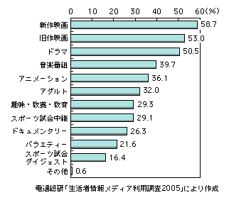 また、今後、視聴要望のある動画コンテンツについては、「新作映画」(58.7%)、「ドラマ」(50.5%)、「音楽番組」(39.7%)となっている(図表1-9-19)。 図表1-9-19 今後視聴したいと思う有料動画コンテンツジャンル(2005年)