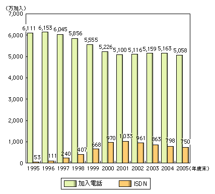 2005年度末における加入電話の加入者数は5,058万加入(対前年度比2.0%減)と2001年度からほぼ横ばいとなっている。 事務用と住宅用それぞれの傾向を見ると、事務用加入電話の加入者数が減少する一方で、住宅用加入電話の加入者数は横ばいとなっている。また、ISDNは、住宅用の加入者数が大きく減少し、事務用はほぼ横ばいとなっている1。 図表2-1-7 加入電話とISDNの加入者数の推移