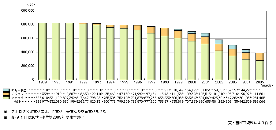 2005年度末における東・西NTT等の公衆電話施設数は、39.3万台(対前年度末比11.1%減)となっており、1999年度以降減少している(図表2-1-9)。 東・西NTTの公衆電話施設は、アナログ公衆電話からデジタル公衆電話へとシフトしつつある。 図表2-1-9 公衆電話施設数の推移