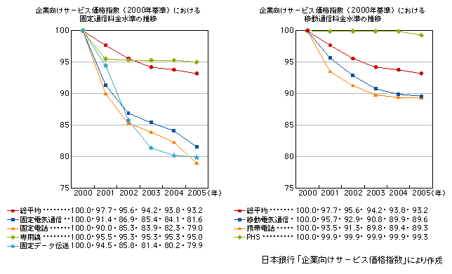 1 国内料金 日本銀行「企業向けサービス価格指数(2000年基準)」によると、固定電話の料金は対前年3.3ポイント減、携帯電話とPHSを合わせた移動電気通信の料金は対2000年10.4ポイント減となっている。 市内通話料の水準は、8円/3分程度であり、2割程度低下している。一方、長距離通話料金は、1985年と比較して5分の1まで低下した(2006年3月末時点)。実際には、多様な料金体系や各種割引サービスもあるため、更に低い水準となる。 図表2-1-33 日本銀行「企業向けサービス価格指数」による料金の推移