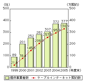 ケーブルテレビは、当初、自然地形やビル陰などによる地上テレビジョン放送の難視聴対策として始まったが、都市型ケーブルテレビを中心として、自主放送番組の提供や衛星放送番組の再送信など多チャンネル化が進展した。2005年度末において自主放送を行う許可施設の加入数は約1,913万世帯、世帯普及率は約38.0%と順調な発展を遂げている。 また、複数のケーブルテレビ事業者を統合した統括運営会社(MSO:Multiple System Operator)と呼ばれる事業者も現れている。 MSOの拡大や近隣事業者による連携等により、ケーブルテレビの経営規模は拡大している。また、経営状況については、2003年度では、営業利益黒字の事業者が初めて8割を超え、ケーブルテレビ事業全体でも営業利益が黒字となった。2004年度では、営業黒字の事業者は81.0%になり、ケーブルテレビ事業全体でも営業利益288億円(対前年度比5.7%増)であり、2年連続黒字となっている。 ケーブルテレビの施設は、放送のみならず、インターネット接続サービス、IP電話等の通信サービスの提供にも活用されており、ケーブルテレビは通信及び放送サービスを総合した「フルサービス」を提供する地域の総合的情報通信基盤に成長している。ケーブルテレビ網を利用したインターネット接続サービスは、2006年3月時点で377社が提供し、契約数は330.9万件(対前年同期比11.8%増)となっている(図表2-2-14)。また、ブロードバンド化等に対応するため、ケーブルテレビ網の幹線における光化及び伝送容量の広帯域化が進展している(図表2-2-15)。 図表2-2-14 ケーブルテレビインターネット提供事業者数と契約数の推移