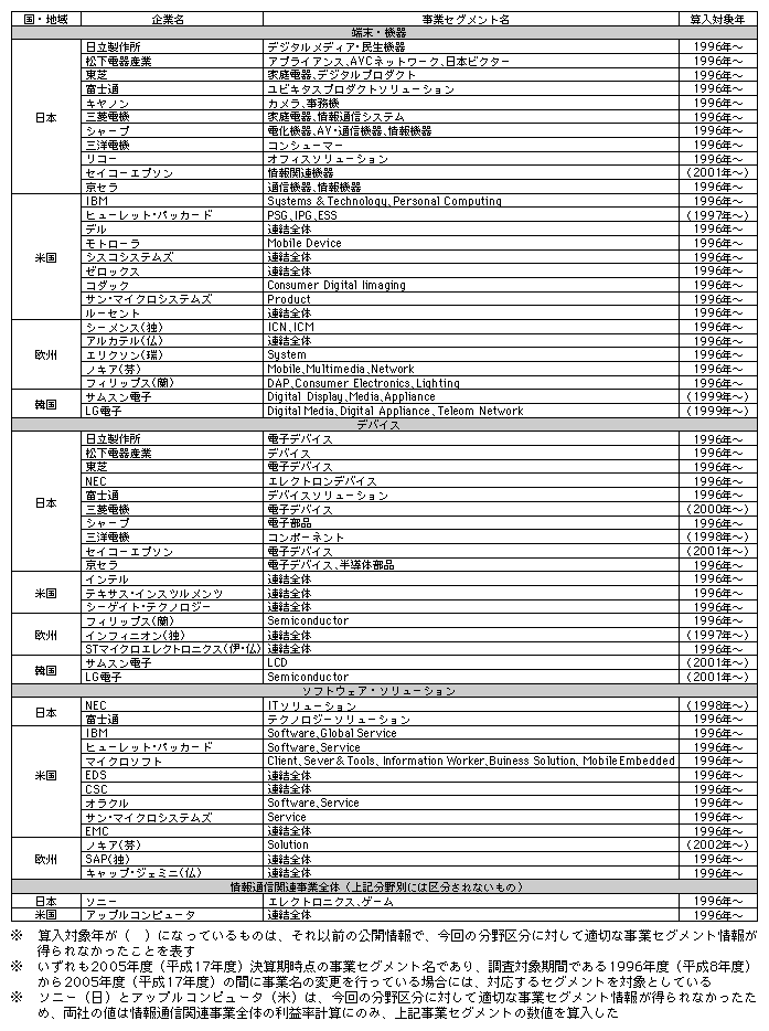 付注12 主要情報通信ベンダーの利益率、自国・自地域売上比率、売上高研究開発費比率の算出方法1 調査対象とした主要情報通信ベンダー 第1章第2節の「1(2)ア 国・地域別の情報通信ベンダーの利益率」、「1(3)ア(ア) 国内市場志向(自国・自地域売上比率)」、「1(3)ウ(ア) 国・地域別の研究開発費(売上高研究開発費比率)」で調査対象とした企業は、原則として2005年度(平成17年度)売上高が「[1]日本企業は1兆円以上」「[2]海外企業は80億ドル以上」の情報通信ベンダーとした。 利益率については1996年度(平成8年度)〜2005年度(平成17年度)、自国・地域売上比率については2005年度(平成17年度)、売上高研究開発費比率については2001年度(平成13年度)〜2005年度(平成17年度)の各決算期の値を用いた。ただし、調査は各社の公開する財務情報を参照しているため、該当する情報が公開されていない企業は、調査対象から除外している。 具体的な対象企業は以下の表のとおり。 ![]() 2 利益率算出の対象事業と算出方法 利益率算出は、各社事業のうち、情報通信関連の事業セグメントのみを対象として行った。各社の対象事業名は以下の通り。 各年度の各国・地域の利益率は、当該事業セグメントの売上高と営業利益率を、国・地域別にそれぞれ合算することによって算出した。各国・地域の1996年度(平成8年度)〜2005年度(平成17年度)の平均利益率は、そのようにして求めた各年度の値を単純平均して算出した。 ![]()