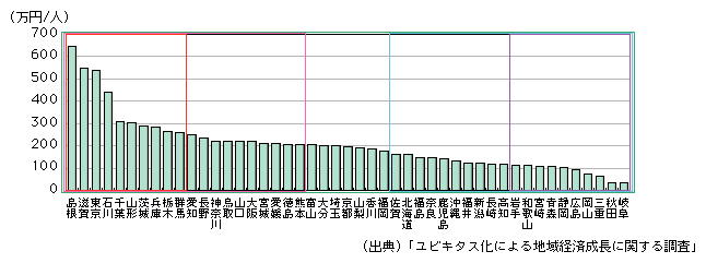 ア 一人当たり実質県内総生産に着目したシミュレーション (ア)シミュレーションケース 2005年の一人当たり実質県内総生産を都道府県ごとに比較したものが図表1-1-1-9である。この図表から分かるとおり、2005年の一人当たり実質県内総生産が最も大きいのは東京都で約774万円/人、最も小さいのは沖縄県で約280万円/人であり、両者の間には約2.8倍の開きがある。所得格差を縮小させるという観点からは、一人当たり実質県内総生産が下位の都道府県に情報通信資本を重点的に蓄積し、これらの都道府県における経済成長を促進する方策が考えられる。しかしながら、経済全体の実質GDP6は、一人当たり実質県内総生産上位の都道府県に情報通信資本を重点的に蓄積する場合や、各都道府県の情報通信資本を満遍なく増加させる場合の方が大きくなるという可能性もある。また、このような配分方法の違い自体、大きな意味を持たないということもありうる。 図表1-1-1-9 2005年の一人当たり実質県内総生産