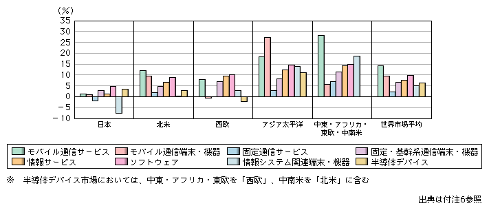 ![]() 市場別に傾向を見ると、情報サービス及びソフトウェア市場については、欧米市場の合計割合がいずれも7割以上を占め、アジア太平洋市場とその他地域市場の合計割合はそれぞれ12.9%、15.2%となっている。モバイル通信サービス、モバイル通信端末・機器及び半導体デバイス市場については、アジア太平洋及びその他地域市場の割合が高く、両市場の合計はいずれも4割から5割を超えている。固定通信サービス、固定・基幹系通信端末・機器及び情報システム関連端末・機器市場においては、欧米市場の合計割合がいずれも6割程度となっており、アジア太平洋及びその他地域市場の合計割合は3割程度となっている。 (イ)世界地域別情報通信市場の成長性 2005年から2007年の地域別の年平均市場成長率を見ると、日本市場の成長率は、いずれの分野においても5%未満となっており、世界市場平均に比べて低い水準にとどまっている。特に情報システム関連端末・機器においては−7.5%と、他市場では見られない大きな縮小幅を示している(図表1-2-2-15)。 図表1-2-2-15 情報通信関連市場の地域別成長率(2005‐2007年平均)