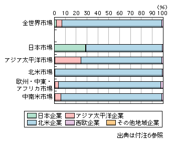 ![]() D サーバー サーバーには、高度なメインフレームから、低価格のローエンドサーバーまで、幅広い製品が含まれる。半導体製品の高性能化によって単位当たりの処理性能が向上していることから、全体としては価格低下が進んでいるものの、グローバルな事業展開を行う企業においては超高性能のメインフレームに対するニーズも高い。2007年におけるサーバー市場規模は約550億ドルである。しかしながら、日本市場においてはユーザー企業におけるサーバー投資が停滞しており、2007年においては台数ベース、金額ベースともに市場はマイナス成長、世界市場に占める割合も年々低下している。 世界市場においては、米国のIBM、HPの2社がトップ企業であり、2社の合計シェアは50%を超える。トップ2社の次には、同じく米国のDellとSun Microsystemsが続いており、米国トップ4社で7割程度の世界シェアを占めている状況である。なお、トップ企業の強みはそれぞれ異なっており、IBMとSun Microsystemsは比較的ハイエンド製品に強く、Dellはローエンド製品に強い。HPは両者の中間である。日本企業としては、富士通、NEC、日立製作所等がトップ企業であるが、いずれも日本国内中心の事業展開にとどまっている。 地域別企業シェアを見ると、いずれの市場においても北米企業が圧倒的なシェアを占めており、日本、アジア太平洋、北米、西欧及びその他地域市場においてそれぞれ54.5%、92.4%、99.5%、88.4%、96.2%となっている。日本企業は、日本市場におけるシェアが45.5%と、自地域内の市場でも米国企業のシェアに及ばない。北米企業と日本企業以外の企業は、ほとんどシェアを獲得できていない(図表1-2-2-53)。 図表1-2-2-53 世界地域別サーバー市場における地域別企業シェア(2007年)