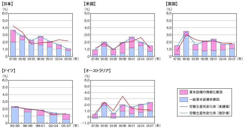 ここでは、生産関数分析について、国際的な比較を実施する。具体的には、EU-KLEMS6のデータを用いて、1985年(昭和60年)〜2007年(平成19年)までのデータを基に日本、オーストラリア、ドイツ、英国、米国について分析を行った7。
