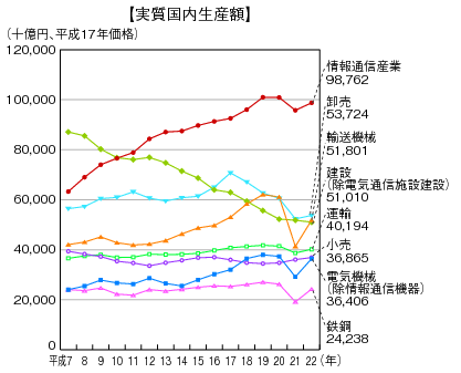 平成22年の情報通信産業の市場規模(名目国内生産額)は85.4兆円で全産業の9.2%を占めており、情報通信産業は、全産業の中で最大規模の産業である(図表4-1-1-1)。その推移をみると、平成12年から平成17年まではほぼ横這いであったが、平成20年以降は他の多くの産業と同様に減少してきた。特にリーマンショック時の平成21年に大きく落ち込み、平成22年では緩やかとなったものの、引き続き減少している(図表4-1-1-2及び図表4-1-1-3)。