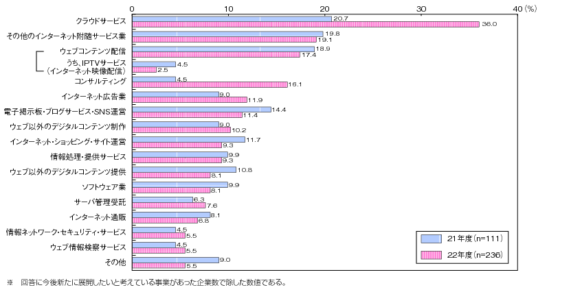 今後新たに展開したいと考えている事業分野の状況をみると、クラウドサービスが36.0%(前年度差15.3ポイント上昇)、コンサルティングが16.1%(前年度差11.6ポイント上昇)となっている(図表4-2-1-12)。